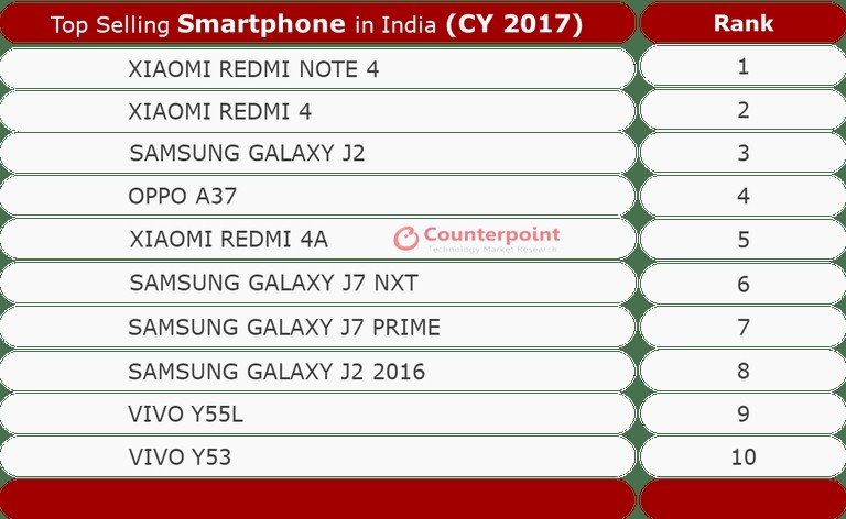 Um novo relatório da Canalys revelou que o smartphone mais vendido na Índia em 2017 foi fabricado pela Xiaomi. O relatório mostra os 10 smartphones mais vendidos na Índia em 2017, confirmando que o Redmi Note 4 foi o best seller. Seguido dele vem outro smartphone da Xiaomi, o Redmi 4, enquanto o Galaxy J2 fecha o TOP 3. Vale notar que a Xiaomi ainda colocou outro aparelho nessa lista, já que o Redmi 4A aparece em quinto lugar. Entretanto, isso não foi suficiente para ganhar da Samsung, que possui quatro smartphones entre os 10 mais vendidos da Índia no ano passado.